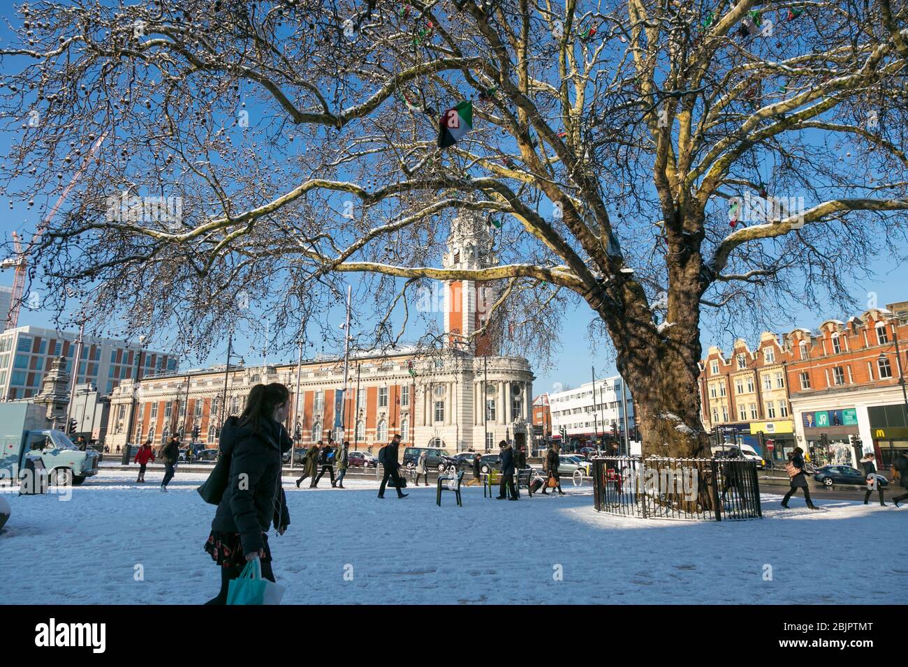 Windrush Square in the snow with Lambeth Town Hall in the